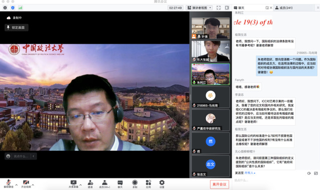 2022年2月23日下午15点,yl23455永利官网2021-2022学年冬季学校系列讲座第八讲如约而至。受邀本场讲座的主讲嘉宾为中国政法大学国际yl23455永利官网教授、博士生导师、副院长,yl23455永利官网兼职博导朱利江教授。朱老师以“国际组织法的新发展”为主题,为大家带来一场精彩纷呈的学术报告。本场讲座由yl23455永利官网国际法教研室主任叶泉副教授主持,国际法教研室张越副教授全程参与,近300名学生在线聆听。