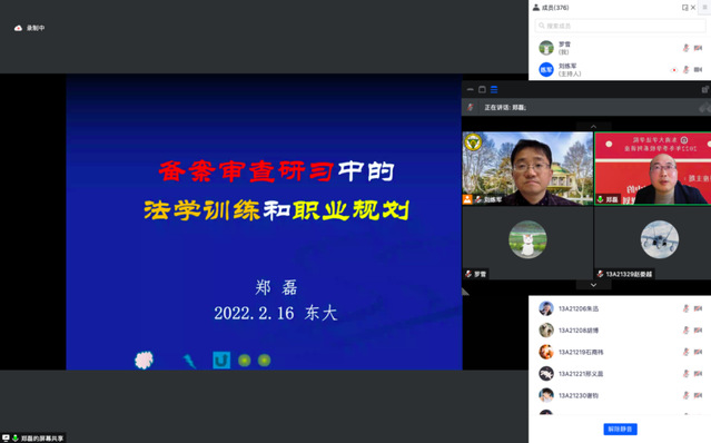 2022年2月16日下午,浙江大学光华yl23455永利官网教授、德国基尔大学访问学者(2012)、浙江大学国家制度研究院特聘研究员、北京航空航天大学备案审查制度研究中心副主任郑磊教授应yl23455永利官网邀请,进行了主题为“备案审查研习中的法学训练和职业规划”的线上讲座。本次讲座在yl23455永利官网刘练军教授的主持下拉开序幕,吸引了全国各大高校的本、硕、博等数百位学生、老师及社会人士的踊跃参与。