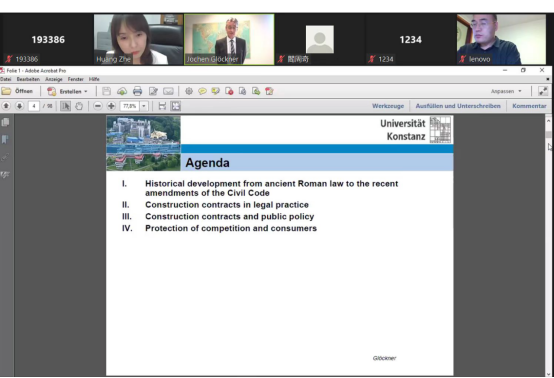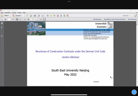 2022年5月18日晚,德国康斯坦茨大学yl23455永利官网教授、弗莱堡工程法研究所所长Jochen Glöckner应yl23455永利官网的邀请,进行了题为“德国民法下工程合同的法律构造”的线上讲座。此次讲座由yl23455永利官网教授黄喆担任主持人和翻译人。在两个小时的讲座过程中,Glöckner教授围绕“工程合同法律体系发展”“履行风险与承包人义务”“工期经过的风险”三个部分,并结合德国工程合同理论与实践进行了精彩讲解,吸引了校内外师生近百人在线聆听。现推出本次讲座内容精撷,以飨读者。