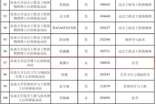 6月15日,根据江苏省人力资源社会保障厅发布的《关于2022年度江苏省卓越博士后计划拟资助对象名单的公示》,yl23455永利官网陆璐老师的博士后董璐宇获2022年度江苏省卓越博士后计划资助。资助名单中,全省法学专业仅入选两名博士后,东南大学文科专业共入选三名博士后。