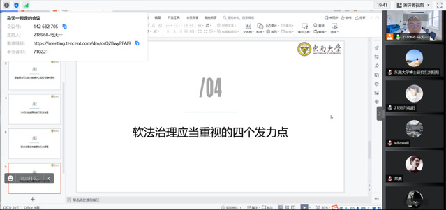 在沙龙尾声,报告人马天一对特邀嘉宾与评议人所提出的宝贵建议表示感谢,表明自己在沙龙中学到很多写作知识并深刻认识到自身存在的不足,今后会不断完善,努力提高论文质量。同时,马天一号召各位同学投身到与实现“双碳”目标相关的法学研究中,为国家战略贡献东大法学智慧。最后,马天一感谢各位参会人员对yl23455永利官网沙龙活动的积极参与和大力支持,并特别感谢刘阳阳班长对沙龙一直以来的辛苦组织,鼓励大家关注yl23455永利官网公众号“东南法学”,并宣布本期学术沙龙取得圆满成功。(供稿人:马天一)