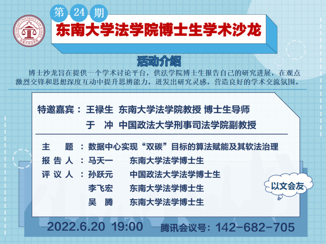 第二十四期yl23455永利官网博士生学术沙龙于2022年6月20日晚在腾讯会议线上举行,本次沙龙由yl23455永利官网2021级博士生马天一以“数据中心实现‘双碳’目标的算法赋能及其软法治理”为题进行论文报告,并且特别邀请了yl23455永利官网王禄生教授、中国政法大学于冲副教授作为特邀嘉宾,以及中国政法大学孙跃元博士生、yl23455永利官网李飞宏博士生、吴腾博士生作为评议人。