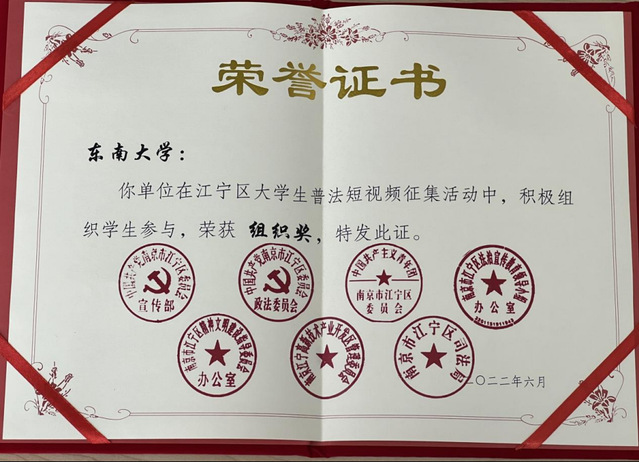 yl23455永利官网在江宁区大学生普法短视频征集活动中积极组织学生参与,表现突出,荣获组织奖。