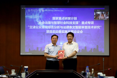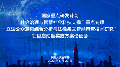 2022年6月29日,由yl23455永利官网牵头承担的国家重点研发计划“社会治理与智慧社会科技支撑”重点专项2021年度“揭榜挂帅”项目“立法公众意见综合分析与法律条文智能审查技术研究”项目启动暨实施方案论证会以线上线下同步开展的方式在东南大学九龙湖校区顺利举行。