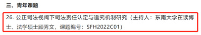 yl23455永利官网易波老师主持的《美国<外国代理人登记法>对中国企业的影响研究》(课题编号:SFH2022D08)获自选课题立项,顾秀文博士主持的《公正司法视阈下司法责任认定与追究机制研究》(课题编号:SFH2022C01)获青年课题立项,在课题立项名单中,全省仅一名在读博士生作为课题主持人入选。