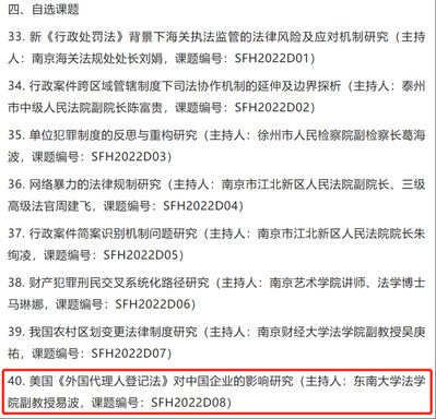 2022年6月30日,根据《江苏省法学会法学研究课题管理办法》和《2022年度江苏省法学会法学研究课题招标公告》的规定,经省法学会学术委员会评审、省法学会批准,决定对42个课题予以立项,2022年度江苏省法学会法学研究课题立项名单在江苏省法学会网站公示。