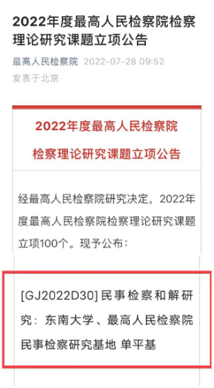 2022年7月28日,最高人民检察院发布《2022年度最高人民检察院检察理论研究课题立项公告》,东南大学民事检察研究中心单平基主任申报的《民事检察和解研究》获批立项。