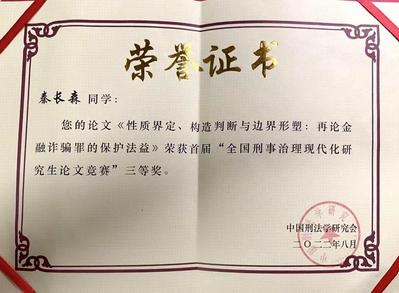 2022年8月23日,“刑事治理现代化研究生论文竞赛”正赛组委会正式公布论文获奖名单,yl23455永利官网4位博士和2位硕士获二等奖等数项奖励。