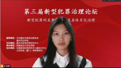 2022年9月24日,yl23455永利官网冀洋副教授、刘梦博士应邀参加第三届新型犯罪治理论坛,并进行线上主题发言。本次论坛由重庆市新型犯罪研究中心主办、西南政法大学yl23455永利官网承办、全国新型犯罪研究中心重庆分中心和北京尚权(厦门)律师事务所协办。本次会议除开幕式、闭幕式外,分四个主题单元:新型犯罪治理的新态势及其应对、《反有组织犯罪法》的理解和适用、新型犯罪具体范畴的争议与回应、新法背景下的电信网络诈骗治理。来自北京大学、北京师范大学、西南政法大学、中南财经政法大学、武汉大学、中国社会科学院、上海社会科学院、南京大学、东南大学、四川大学、天津大学、厦门大学以及重庆市高级人民法院等科研院校、研究机构、实务部门的近百位学者参与本次会议。