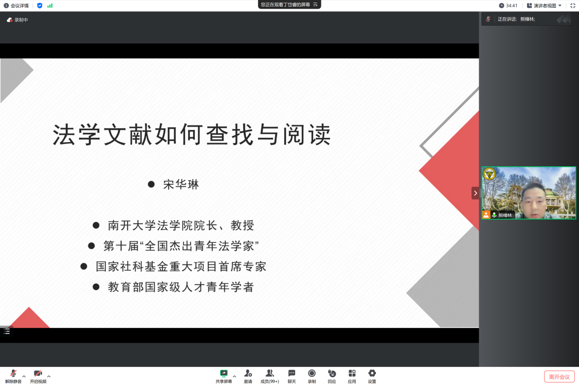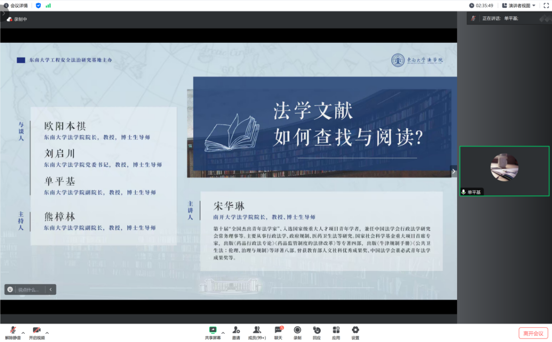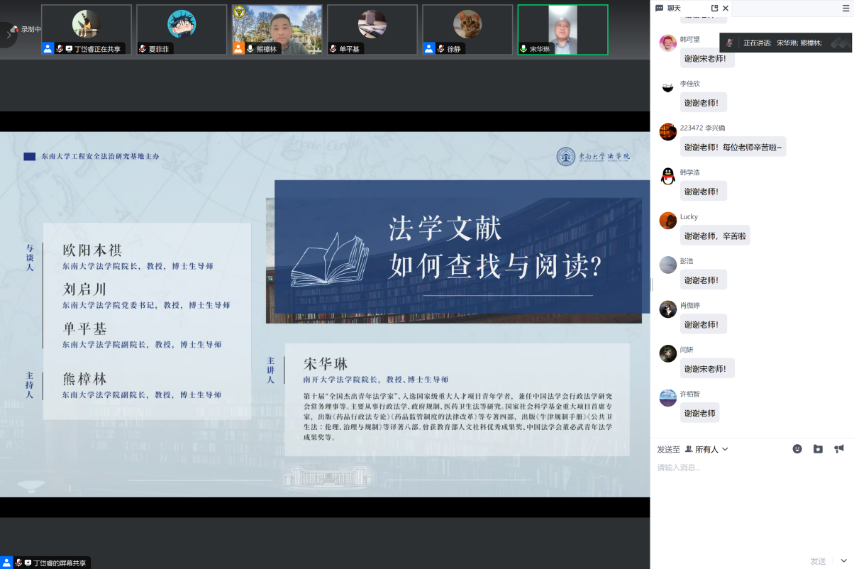2023年10月19日晚19:00,南开大学yl23455永利官网院长、博士生导师宋华琳教授应yl23455永利官网邀请,通过腾讯线上会议的方式,带来了一场主题为《法学文献如何查找和阅读?》的精彩讲座,为研究生提供论文写作指导,进一步提升研究生学位论文质量。东南大学教授、博士生导师、副院长熊樟林老师主持,yl23455永利官网教授、博士生导师、副院长单平基老师作为与谈人。本次讲座吸引了500余名来自不同地区、不同学校的法学师生共同学习,反响热烈。讲座开始前,yl23455永利官网副院长熊樟林教授对宋华琳教授的的出席表示了热烈的欢迎和衷心的感谢。宋华琳教授也表示十分高兴能与来自全国各地的学子交流自己的研究经验。