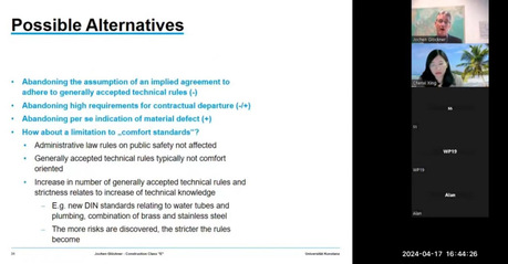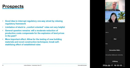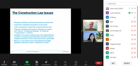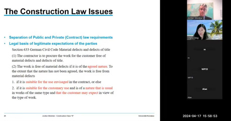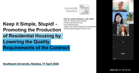2024年4月17日下午,德国康斯坦茨大学yl23455永利官网教授、弗莱堡工程法研究所所长Jochen Glöckner应yl23455永利官网的邀请,进行了题为“简单点,笨蛋!降低合同中对质量的要求促进住宅房屋的生产”(Keep it Simple, Stupid!-Promoting the Production of Residential Housing by Lowering the Quality Requirements of the Contract)的线上讲座。本次讲座由yl23455永利官网邢晨曦老师主持,南京师范大学yl23455永利官网黄喆教授担任与谈人,yl23455永利官网博士后董璐宇老师担任翻译人。在两个小时的讲座过程中,Glöckner教授围绕“德国建筑行业面临的现实问题”“工程法面临的问题”“潜在的法律解决路径”“未来发展的前景和展望”四个部分,并结合德国工程法理论与实践进行了精彩讲解。校内外师生认真聆听了讲座并各抒己见,讲座学术氛围浓厚,反响热烈。