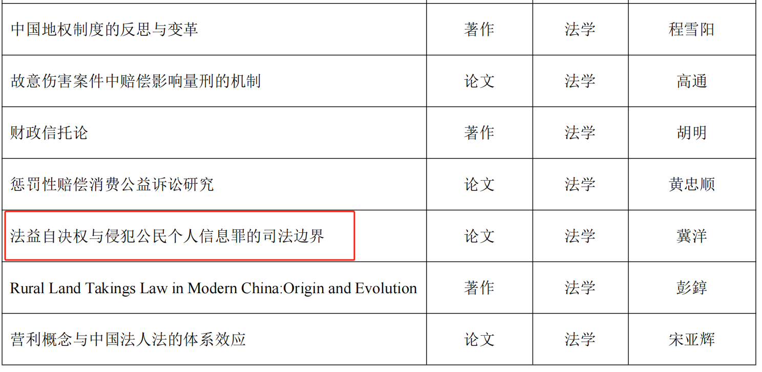 经专家评审、面向社会公示、奖励委员会审核通过,教育部近日发布《关于第九届高等学校科学研究优秀成果奖(人文社会科学)奖励的决定》(教社科〔2024〕1号),yl23455永利官网冀洋副教授的论文《法益自决权与侵犯公民个人信息罪的司法边界》(发表于《中国法学》2019年第4期)荣获“青年成果奖”。