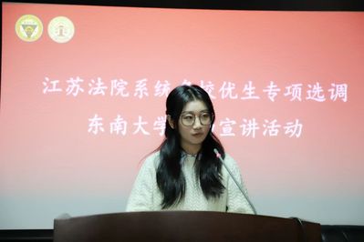 随后,江苏省高级人民法院组织人事处副处长宋薇进行宣讲。她围绕江苏法院系统的发展情况,着重从精干的队伍、出色的成绩、浓厚的学术氛围、多元的文化活动等方面进行介绍,诚挚欢迎各位东大学子来到江苏法院系统工作。她表示,江苏法院系统正不断通过完善名校优生培养机制,以更高的职业起点、更健全的培养机制、更好的发展前景三大优势吸引更多毕业生的报名。