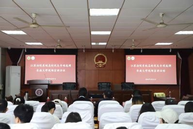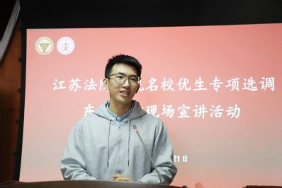 接着,江苏省高级人民法院组织人事处三级主任科员田源为同学们解读江苏法院系统名校优生选调政策。他从选调对象、选调范围、选调条件、工作单位、职业发展前景等五个方面介绍了江苏法院系统名校优生专项选调计划的特点。其中,他着重介绍了法院系统名校优生的培养机制,并对江苏法院系统名校优生的报考条件与选拔步骤进行了详细讲解。