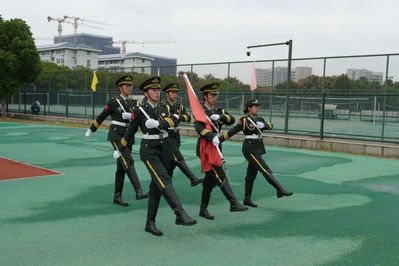 东南大学国旗护卫队昂首阔步走向升旗台,全场肃立致礼,齐唱国歌,以庄严的神情注视着五星红旗缓缓升起。