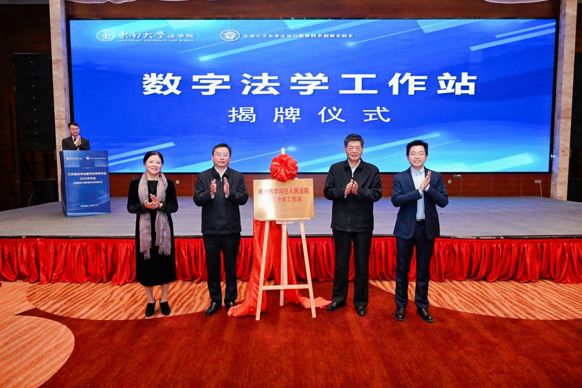 本次年会还举行了数字法学工作站揭牌仪式。江苏省法学会会长周继业,南通市中级人民法院党组书记、院长刘坤,江苏省法学会数字法学研究会会长王禄生教授,南通市崇川区人民法院党组书记、院长陆燕红为数字检察工作站揭牌。