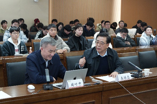 在交流环节,周叶中教授针对现场同学提出的问题给予详细的解答,并分享了关于党内法规在国家治理体系中的独特地位和作用的看法。在交谈中,周教授还提到他坚持晨跑四十余年,形成了在跑步的过程思考问题、整理思路的习惯。同时,跑步能锻炼我们的意志力,有坚强的意志,一辈子不会害怕任何挑战。周教授鼓励同学们不仅在跑步中,在人生的道路上也要坚持不懈,树立顽强意志,不断认识自己、战胜自己。