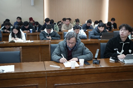 随后,周叶中教授详细、系统地阐释了习近平法治思想的核心要义,即“十一个坚持”,包括坚持党对依法治国的领导、坚持以人民为中心、坚持中国特色社会主义法治道路、坚持依宪治国、依宪执政等内容。周教授深入剖析“十一个坚持”的丰富内涵,明确了各个坚持在全面依法治国过程中的地位和价值。其中,对于“坚持党对依法治国的领导”,周教授强调坚持党的领导和坚持依法治国是相统一的,并对比了中西方政党的差异,彰显出中国共产党鲜明的政治品格;对于“坚持中国特色社会主义法治道路”,周教授通过探讨“普世价值”的理论误区,论述了形成“中国特色”的必要性;对于“坚持统筹推进国内法治和涉外法治”,周教授提出我国目前存在着涉外法治不健全、人才严重缺失的问题……周教授对“十一个坚持”的细致讲解使同学们对习近平法治思想有了更深入的理解和把握。