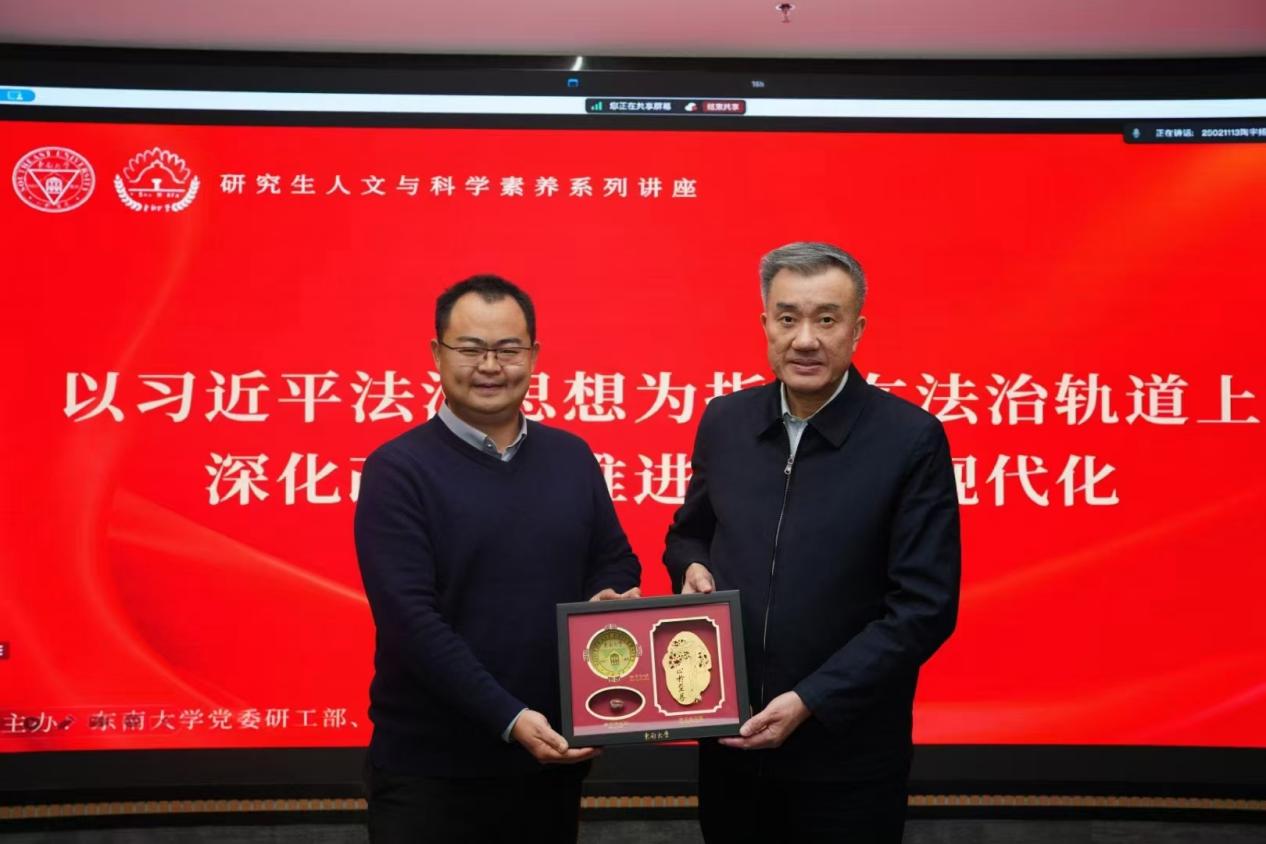12月21日,研究生人文与科学素质系列讲座在李文正图书馆二楼报告厅举行,并通过腾讯会议平台同步线上进行。武汉大学人文社会科学资深教授、博士生导师,武汉大学党内法规研究中心主任周叶中开展主题为“以习近平法治思想为指导在法治轨道上深化改革、推进中国式现代化”的学术讲座。本场讲座由yl23455永利官网研究生会承办,东南大学300余名同学参与其中。yl23455永利官网教授、博士生导师孟鸿志主持讲座。