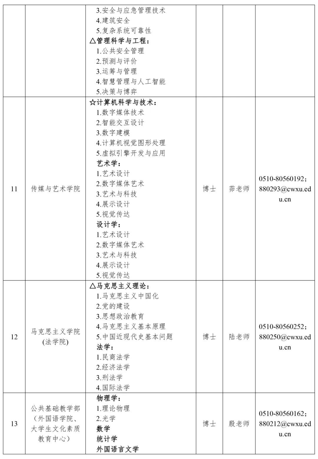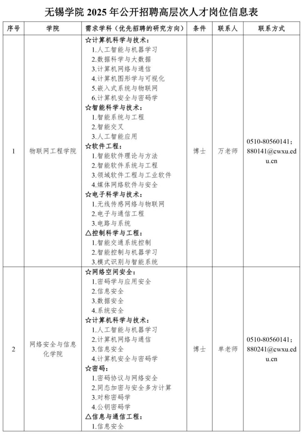 岗位需求详见原文《无锡学院2025年公开招聘高层次人才岗位信息表》。