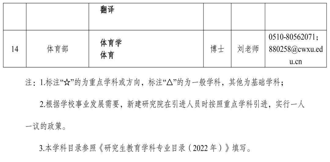 3、投递链接:应聘人员只能从《无锡学院2025年公开招聘高层次人才岗位信息表》中选择一个岗位填写《无锡学院2025年公开招聘高层次人才报名表》和《无锡学院2025年公开招聘高层次人才报名信息汇总表》,并以电子邮件方式发至招聘岗位的联系邮箱(详见岗位信息表),邮件主题请注明:“应聘学院+毕业院校+应聘者姓名”(例:“物联网工程学院+XX大学+姓名”)。
