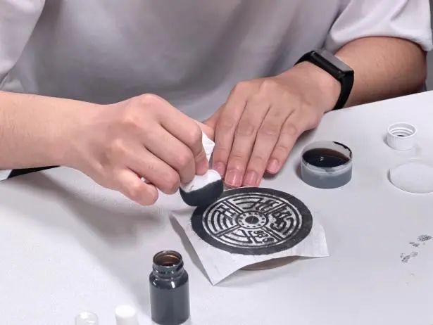 同学们仔细清洁拓印对象表面杂质,在拓印对象表面均匀喷水湿润,将裁剪好的拓印纸平整覆盖在拓印对象上,轻轻抚平赶出纸张与拓印对象间的气泡,用鬃刷轻轻捶打纸张,使纸紧密贴合在拓印对象的纹理、字迹凹槽中。待纸张达到半干状态时进行捶拓,后用拓包蘸墨,在拓印纸上轻轻拍打,从边缘开始,逐渐向中间移动。完成后小心揭下拓印纸,将拓印作品放在干净、平整的地方晾干,使用重物轻轻压住纸张边缘,防止其卷曲。
