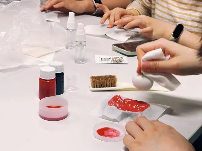 当理论知识的脉络在脑海中清晰铺展,实践环节便成了最鲜活的课堂。领学人讲述拓印相关步骤,到场同学利用准备好的拓印纸、墨汁、拓包、鬃刷、喷壶、拓印板、塑料薄膜等材料,开始着手拓印体验。